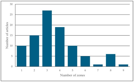 Considering the number of zones, we found that ninety-six articles (79%) present the zone types and the number of zones of the zoning plan. The number of zones presented in the articles ranges from one to nine, with the most common division into three zones (27 articles) (Figure 3). We used the Marine Conservation Institute’s marine protection atlas (MPAtlas) for the size estimation of MPAs included in the review articles. These MPAs were classified into four classes by size. The classification examined the size of the study area and the number of zones defined in terms of size as follows: (1) very small <10 km2, (2) small 10–100 km2, (3) large 100–100,000 km2, and (4) very large >100,000 km2. The large size area is the most common regardless of the number of zones in the study. Furthermore, there appears to be no correlation between the area size and the number of zones planned (Figure 4).