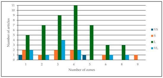 The number of articles according to the number of zones included in the zoning plan broken down by study area size (VS = very small, S = small, L = large, and VL = very large).