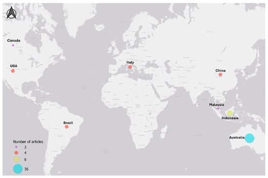 The number of articles focusing on Australia is significantly higher than the other regions studied. Of the 36 articles mentioning Australian study sites, 14 focus on the Great Barrier Reef (GBR, which was rezoned in 2004), 5 on New South Wales, 5 on Port Stephen Moreton Bay region, and 1 each on Ngari Capes Marine Park, Jurien Bay Marine Park, and Eyre Peninsula. The second-most-studied area is Indonesia with six articles. Three of the articles studied different separate and specific areas; however, the other three articles focus on a marine protected area network in Raja Ampat, where a zoning plan was implemented in 2012 [45,46,47]. Both MPA Raja Ampat and the GBR are marine zoning areas that have been managed for a relatively long period.