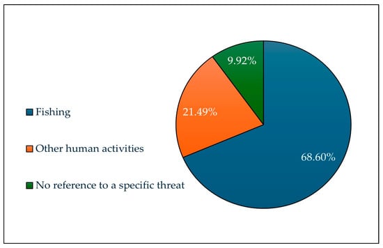 Clearly fishing is the predominant human threat cited in the marine zoning articles reviewed. Fishing is a human activity that, without management or regulation, can easily become a threat. Grouping together the articles that identified fishing as a primary threat reveals that 68.6% of the reviewed articles cited fishing as a human threat (Figure 6). In some cases, fishing is mentioned as the main threat, while in others, it is listed together with several other human threats. Meanwhile, 21.49% of the articles referred to human threats in general, excluding fishing, and the remaining 9.92% did not mention human threats at all (Figure 6).