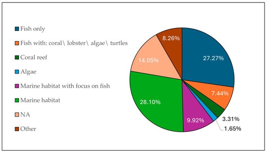 In addition to coral reef habitats, seagrass and algae were also found to be underrepresented as main study subjects for preservation and protection (Figure 7). Less than 2% of the articles reviewed presented algae as a research objective, and none presented seagrass as the main subject. Both algae and seagrass have high ecological and socioeconomic significance and provide valuable ESs. Marine algae and seagrass provide habitats for various species and have high carbon sequestration potential. Moreover, both are used as food extracts in pharmaceuticals, cosmetics, and industrial applications, and some species can be used in agriculture [91,92,93].