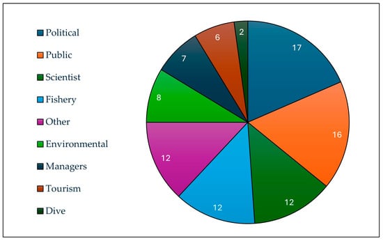 Stakeholder engagement in most case studies includes various types of stakeholders. The most common stakeholder type in the review articles is the policy or decision-making echelon (Political—17 articles, Figure 8), representing members of local government, government agencies, and relevant government departments (e.g., fisheries, planning, tourism department, maritime affairs, and environmental agencies). The next most common stakeholder is the public sector (Public—16 articles, Figure 8), which includes several entities such as indigenous groups, local communities, residents and property owners, community leaders, and local users. This stakeholder type is followed by scientists and the fishing sector, i.e., fishery representatives (12 articles each). The category “Other” refers to unique stakeholders that participate due to the specific study aim and area, such as boating organizations, business owners, nature reserve employees, architects, engineers, NGOs, farmers, livestock growers, and manufacturers.