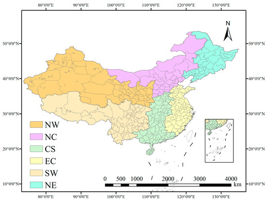 This study focused on the entire Chinese mainland, excluding Hong Kong, Macao, and Taiwan. China is located in East Asia, with a longitude of 73°33′ to 135°05′ east and a latitude of 3°51′ to 53°33′ north. The study divided the country into six major regions based on geographical divisions: northeast China (NE), north China (NC), east China (EC), central south China (CS), northwest China (NW), and southwest China (SW) (Figure 1). Each region exhibited distinct climatic characteristics and levels of economic development, contributing to the diversity and complexity of driving factors. Data on China’s administrative divisions were from the 2024 version of the National Platform for Common GeoSpatial Information Services (https://cloudcenter.tianditu.gov.cn/administrativeDivision, accessed on 16 May 2024), provided by the National Geomatics Center of China. The map review number was GS (2024)0650, and the coordinate system used was GCS_WGS_1984.