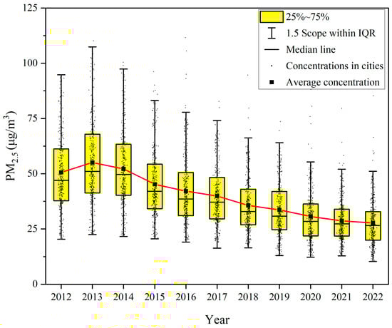 Temporal trends in PM2.5 annual concentrations from 2012 to 2022 in China.