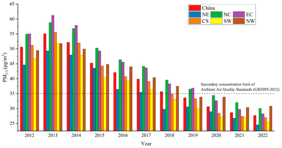 Average PM2.5 concentrations of six regions in China from 2012 to 2022.