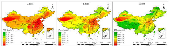 To illustrate the differences in the spatial distribution characteristics over time, three representative years were selected: 2013, when the PM2.5 pollution was most severe; 2017, when the “Blue Sky Protection Campaign” was launched and the first improvements were observed; and 2022, which marked the next stage of air quality management with significant reductions in pollution. These years were used to show the spatial distribution patterns and changes in the PM2.5 concentration levels nationwide.