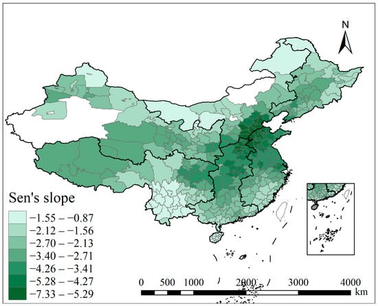 Sen’s slope estimation was utilized to analyze the trend in the PM2.5 concentration values across China cities from 2012 to 2022. As shown in Figure 5, the Sen’s slope for most cities in China was less than 0, indicating a significant decreasing trend in PM2.5 concentration levels (p < 0.01). Average annual decreases ranged from 1.48 to 7.33 μg/m3.