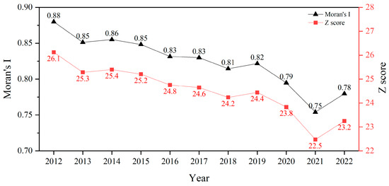 To study the aggregation of the spatial distribution of PM2.5 in China from 2012 to 2022, the global Moran’s I for each year is presented in Figure 6. The higher the Moran’s I, the stronger the correlation of PM2.5 concentrations between adjacent cities; conversely, the lower the Moran’s I, the weaker the correlation. The index revealed significant spatial autocorrelation each year (p < 0.01), indicating a clear spatial clustering of the PM2.5 concentration levels among cities in China. This result suggested that the PM2.5 levels in a city were affected not only by its conditions but also by those in neighboring cities. The Moran’s I index ranged from 0.75 to 0.88, and the Z score varied between 22.5 and 26.1. This clustering suggested that the pollution levels in cities not only were determined by local factors but were also influenced by neighboring cities, highlighting the interconnected nature of environmental challenges across regions. Throughout the study period, these values generally showed a declining trend, reflecting that while the PM2.5 concentration levels in China consistently exhibited spatial clustering, this effect gradually diminished. This reduction in spatial correlation indicated the success of pollution control measures that have contributed to breaking down regional pollution concentrations, signaling progress toward more balanced, sustainable urban development. Compared with studies at smaller regional scales, PM2.5 across all cities in China exhibited stronger spatial autocorrelation [46].