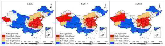 By applying the local autocorrelation method, we generated maps depicting the spatial aggregation of PM2.5 concentrations in Figure 7 for 2013 (a), 2017 (b), and 2022 (c) to highlight their local correlation patterns. The findings showed similar aggregation trends throughout these years. The distribution of the high–high concentration areas remained largely unchanged, primarily centered in the “severe pollution area”. These regions continued to form extensive high–high concentration zones, indicating significant spatial clustering of elevated PM2.5 levels. This clustering was predominantly due to the development of heavy industry and widespread coal usage in these areas. In southern Xinjiang, the presence of the Taklimakan Desert, coupled with unique natural conditions, such as aridity and basin terrain, contributed to the accumulation of PM2.5, resulting in consistently high particulate matter concentrations in this region [47]. In parallel, an obvious high–high clustering distribution was also recorded. These high PM2.5 concentration areas are particularly important for targeted policy intervention as they represent the regions with the most severe air quality challenges and where pollution control measures are most needed. There were generally no obvious high–low clustering areas across the country.