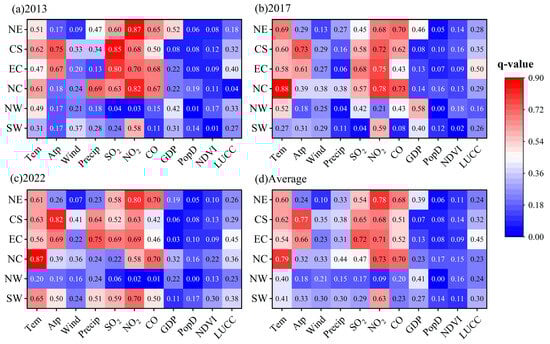 Using the GeoDetector, the q-values for the six regions for 2013, 2017, and 2022 and the averages of these three years were obtained, as shown in Figure 8. A higher q value suggested a stronger influence of the factor on the spatial variation of the target variable. The analysis revealed substantial regional variation in the driving factors influencing PM2.5 concentrations, with distinct temporal trends across different areas.