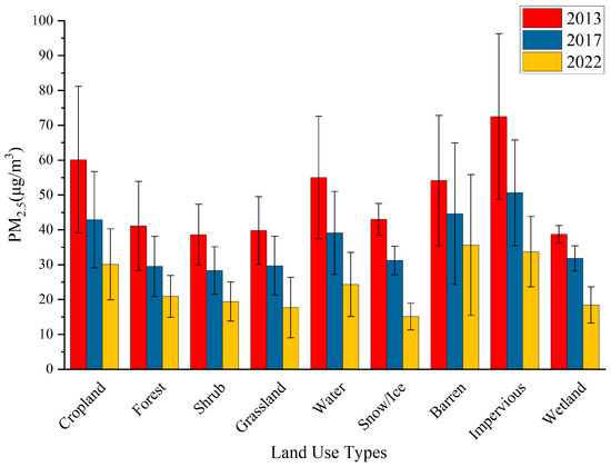 We combined the spatial distribution characteristics of land use types in 2013, 2017, and 2022 (Figure S4) and compared the differences and changes in the PM2.5 concentrations under nine land use types. Understanding the role of land use in air quality management is crucial for promoting sustainable urban development and improving environmental health. The overall distribution of land use types across the three years remained relatively consistent. The barren type was predominantly located in much of the northwest region, and cropland was mainly found in southern north China, northern northeastern China, northern central and southern China, and western northeastern China. The forest type was distributed across most of southern China, and grassland occupied most of the western region, excluding areas classified as barren. Impervious surfaces were concentrated in areas with higher population density. Additionally, specialized land use types, such as shrub, water, snow/ice, and wetland, were scattered throughout various regions of China.