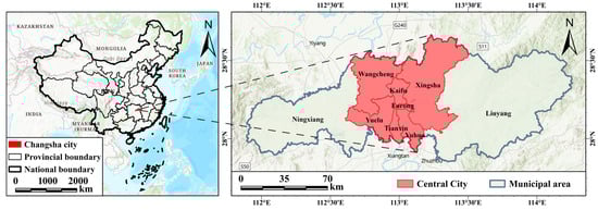 Changsha, a major city in central China (Figure 2), offers significant advantages as a research site. Its central urban area has a high population density, with approximately 7 million residents and 617 administrative units (streets and villages), accounting for about 70% of the city’s permanent population. This region serves as the core hub of Changsha’s political, economic, cultural, and social activities. Its complex and diverse urban built environment—including varied land use types, intricate street networks, and abundant public facilities—offers a diverse dataset for this research. Additionally, Changsha has accumulated extensive urban planning and management data. Previous studies have utilized theft crime data from specific districts in Changsha, combined with GIS, to analyze the spatiotemporal distribution of crimes, serving as a valuable data source and methodological foundation for this study [28]. Furthermore, Changsha has undergone rapid urbanization in recent years, resulting in significant changes to its built environment, positioning it as an exemplary case for investigating criminal behavior amidst rapid urbanization. Based on these factors, Changsha exhibits comprehensive advantages in urban characteristics, data availability, research foundation, and developmental dynamics, establishing it as an ideal region for exploring the influence of urban built facilities on crime.