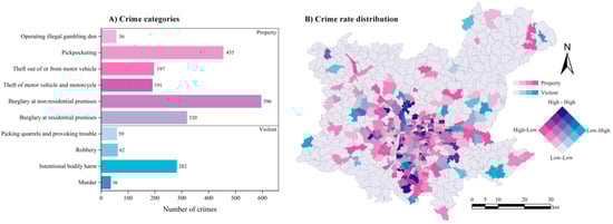 The classification and spatial visualization of crime data (Figure 3A) reveal that property crimes significantly outnumber violent crimes. Among these, “non-residential theft” and “residential theft” are the two most frequent types of property crimes, indicating that these crimes predominantly target fixed assets or vehicles, which are closely associated with the spatial distribution of economic activities and population mobility. Additionally, “pickpocketing” and “motor vehicle and motorcycle theft” occur at higher frequencies, highlighting the tendency of urban transportation hubs and crowded areas to attract criminal activities. In contrast, violent crimes occur relatively infrequently; however, particular attention should be directed toward “intentional injury” and “provocation”, as these crimes are often linked to social conflicts and the emotional escalation of events. While “murder” cases are infrequent, their severity cannot be overlooked. Overall, the occurrence of violent crimes appears to be strongly associated with socio-economic conditions, community safety, and the efficacy of public management.