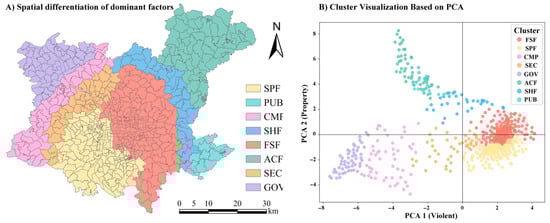 Principal Component Analysis (PCA) [33] is a statistical dimensionality reduction method aimed at projecting high-dimensional data into a lower-dimensional space while preserving as much of the original data’s primary information as possible. By extracting the eigenvalues and eigenvectors along the directions of maximum variance in the data, several principal components are constructed to explain the main variation trends among the original variables. In this study, PCA clustering visualization illustrates the relationships between facility-dominant factors and violent and property crimes, providing an intuitive basis for spatial governance and crime prevention.