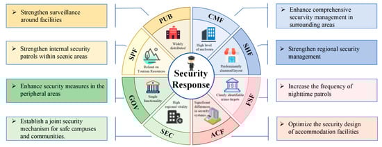 Furthermore, the integration of intelligent public security management systems, such as crime prediction models leveraging big data and real-time monitoring technologies, can facilitate the precise identification of high-risk areas, allowing for the preemptive allocation of resources and optimization of crime prevention efforts. These strategies have been successfully implemented in major international cities, such as New York and London, where intelligent surveillance systems have significantly reduced crime rates in urban cores [37]. In contrast, the suburban–rural fringe displays distinct crime patterns that differ significantly from those of urban centers. Although property crimes remain prominent in these areas, violent crimes occur with much lower frequency. This pattern can be attributed to the limited availability of facilities and the relatively stable social relationships in these regions. Research indicates that crime in suburban–rural fringes is often associated with single-function facilities and the concentration of transient populations. These factors collectively shape the unique crime dynamics in such areas. Unlike the crime patterns observed in urban centers [38], suburban–rural fringes are characterized by the coexistence of low-frequency violent crimes and high-frequency property crimes. Effective crime prevention in suburban–rural fringes should prioritize the integration of multifunctional facilities and avoid single-function facility layouts. Promoting the synergy between infrastructure and social services can enhance social cohesion and strengthen crime prevention mechanisms. For instance, improving public transportation infrastructure, establishing community activity centers, and implementing targeted transient population management strategies can effectively improve social control and foster a greater sense of safety among residents. Tourism areas, on the other hand, exhibit a high incidence of violent crimes, primarily driven by the mobility of tourists and insufficient management resources during holiday periods. This aligns with international studies, which highlight the heightened risk of violent crimes in tourist destinations [39]. Tourist attractions, due to their unique social environments and high visitor density, often emerge as high-risk areas for violent crimes. For example, international crime studies have shown that the crime rate in tourist destinations during holiday periods is typically higher than during regular periods [40]. To address this issue, planning responses in tourist areas should focus on the deployment of temporary safety facilities during peak seasons, such as temporary security patrol stations and reinforced security measures at key tourist entrances and transportation hubs. Additionally, the adoption of intelligent security systems, including facial recognition and behavior analysis technologies, can facilitate real-time monitoring of tourist behavior, enabling the swift identification of potential threats and effectively preventing violent crimes. In and around university towns, education and SEC play a crucial role in mitigating crime by fostering community interaction and enhancing social supervision. Consistent with prior studies [41], educational and cultural facilities have been shown to significantly contribute to social stability in university areas. However, as transient populations increase, the crime-prevention effectiveness of cultural facilities may diminish. High-mobility areas often experience dynamic shifts in social structures, which can weaken the ability of cultural facilities to reduce crime. Research indicates that areas with high transient populations tend to have higher crime rates, particularly violent crimes [42,43]. Consequently, planning efforts should emphasize managing transient populations while diversifying cultural facilities to enhance their crime prevention potential. Lastly, industrial parks generally exhibit lower crime rates, primarily due to the stability of economic activities and the relatively regular working hours of their workforce. Studies have found that the low crime rates in industrial parks are closely linked to stable production activities and high levels of employee engagement [44,45]. However, maintaining these low crime rates requires proactive measures, such as fostering collaboration among enterprises and installing additional security facilities, particularly at the intersections of worker residential areas and commercial zones.