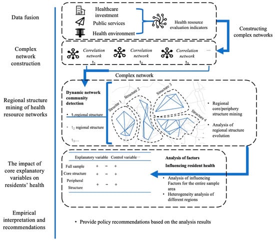 Current research has established a relatively robust framework for comprehensive health resource evaluation systems. Regarding determinants of population health, extant studies have developed multidimensional indicator systems through diverse analytical perspectives. These evidence-based frameworks enable systematic examination of health influencers, thereby informing the formulation of targeted intervention strategies for subsequent health promotion initiatives. These studies have provided new perspectives and ideas for understanding health resources and their impact, but they have still had some limitations. Currently, more than 1200 cities worldwide have joined the Healthy Cities initiative, forming a global network of healthy cities. China’s regional health resources exhibit a distinct network structure; however, research remains limited in constructing health resource networks from the integrated perspectives of spatial econometrics and complex network theory, particularly in examining how network positions influence residents’ health outcomes. Consequently, this study employs the entropy weight method to determine indicator-specific weights, constructs a health resource network using complex network analysis techniques, and examines the dynamic evolution of the health resource network alongside the heterogeneity of its community structures. Furthermore, econometric models are utilized to investigate the influence, spatial spillover effects, and heterogeneity of health resource network positions on residents’ health outcomes. The overall research framework of this paper is shown in Figure 1.