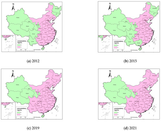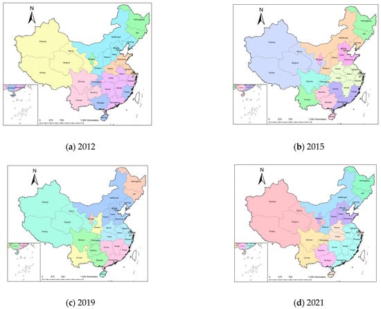 As shown in Figure 2, the network was partitioned into seven communities in 2012 and eight communities in 2015, 2019, and 2021. The community detection results over the years indicate a certain degree of stability in the composition of these clusters, which largely correspond to China’s seven major administrative regions: Northeast, North China, East China, Central China, South China, Northwest, and Southwest. Regions located at the boundaries of these divisions are more prone to dynamic reassignment across communities, while the cluster consisting of Tibet, Gansu, Qinghai, and Xinjiang exhibits the highest stability, remaining consistent throughout the entire observation period.