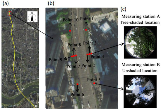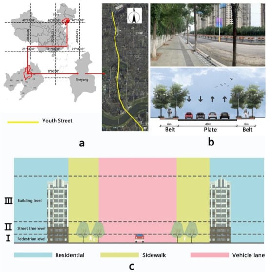 (a) Study area location; (b) site status photos and typical street planting forms; (c) the street elevation of the study area.