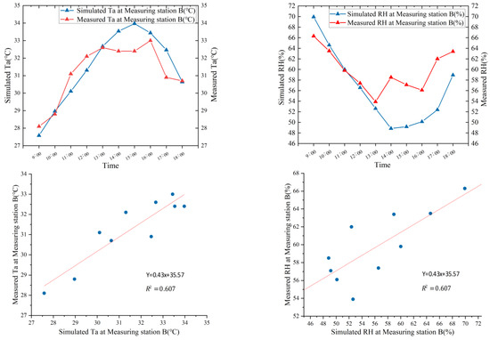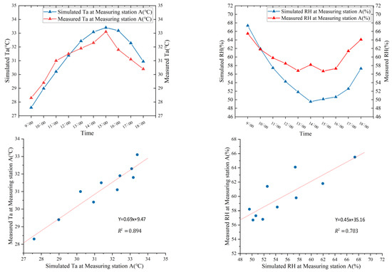 The trends and linear regression analysis of the simulated and measured values of Ta and RH at measuring points 4 and 5.
