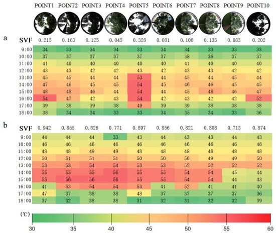 The measuring point SVF and PET from 09:00 to 18:00. (a) PET of current site with trees from 09:00 to 18:00. (b) PET of current site with no trees from 09:00 to 18:00.