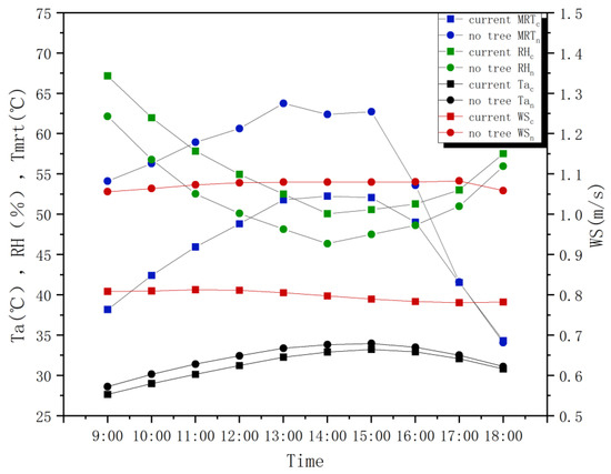 The simulation area is discretized with a horizontal grid size of 70 × 95 × 100, using three nested grids, and a resolution of 2 m × 2 m × 2 m. Meteorological data for the ENVI-met simulation were obtained from the China Standard Climate Monitoring Station in Shenyang (41°11′ N; 122°25′ E; 40 m above sea level). On 3 July 2023, the minimum and maximum daytime Ta were 20.24 °C and 32.80 °C, respectively, with RH ranging from 51.91% to 96.80%. WS was set at 1.7 m/s, with an inflow direction of 206°. Each simulation run lasted from 06:00 to 20:00, totaling 13 h.