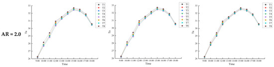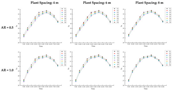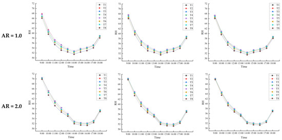 The simulated output data are presented in Table S1. Figure 8 shows the comparison of Ta at the pedestrian level (1.5 m) under different scenarios. Ta increases until 14:00 and then decreases. Comparing the results with different AR, the average Ta with higher AR (AR = 2.0) is the lowest, indicating greater heat mitigation ability. The average Ta in the street canyon with N-S/0.5/4 m/T8 (AR = 0.5) is 0.24 °C higher than that with N-S/1.0/4 m/T8 (AR = 1.0). The average Ta in the street canyon with N-S/2.0/4 m/T8 (AR = 2.0) is the lowest, approximately 0.23 °C lower than that with N-S/1.0/4 m/T8 (AR = 1.0).