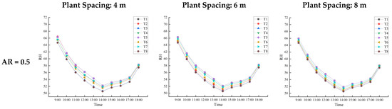 The simulated output data are presented in Table S2. The results show that, at the pedestrian level (1.5 m), the RH exhibits a distinct temporal pattern under different plant spacing scenarios (Figure 9). Unlike Ta, RH decreases until 14:00 and then increases. During the simulation period, the RH under the scenario with 8 m plant spacing is lower than with 4 m and 6 m plant spacing, with average differences of 0.40% and 0.30%, respectively. Under the same street AR and plant configuration, the humidification effect of different plant spacing configurations follows the order of 4 m, 6 m, and 8 m, from largest to smallest.