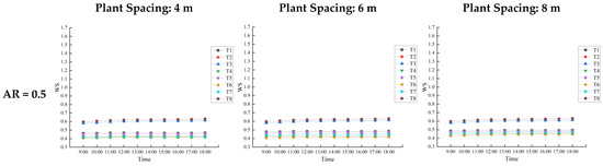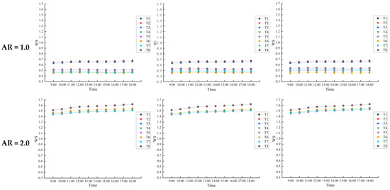 The simulated output data are presented in Table S3. The results show that street ventilation, as indicated by WS, increases with increasing street AR. Figure 10 presents the WS line charts for each scenario throughout the day. For example, in the T1 scenario with a plant spacing of 4 m, when AR = 0.5 (N-S/0.5/4 m/T1), the average WS in the middle of the street is 0.47 m/s. When AR = 1.0 (N-S/1.0/4 m/T1), the average WS in the same area increases to 0.52 m/s. When AR = 2.0 (N-S/2.0/4 m/T1), the average WS further increases to 1.49 m/s. This indicates that higher street ARs are associated with stronger street ventilation.