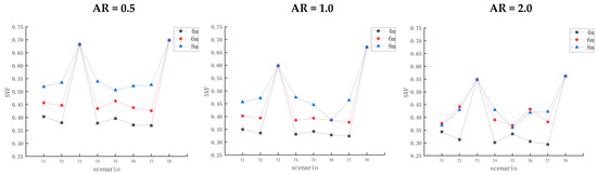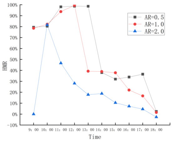 The percentage decrease in PET values for treeless T8 was compared with that for T5 across three different street ARs, as shown in Figure 13. The results show that they all present a trend of increases followed by decreases. Lower ARs cause more significant average HMRs of plants. When AR = 0.5 and AR = 1.0, the highest HMR appeared at 12:00 with values of 9.87% and 9.94%, respectively. When AR = 2.0, the highest HMR appeared at 10:00, at a value of 8.16%. The smaller the street AR, the more obvious the heat mitigation effect of plants on the street environment. Combining HMR of plants and the overall comfort brought by buildings on both sides of the street, when AR = 1.0, (T5/6 m) has a higher HMR on the street. It can be seen from the results that even the optimal combination of trees (T5/6 m) has different HMRs at different street ARs.