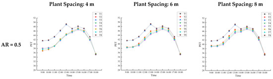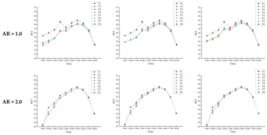 Next, the variation trend of T5 at different spacings is compared. As shown in Figure 12, closer tree spacing results in lower PET values, and this trend remains unchanged regardless of the AR. Smaller plant spacing of street trees leads to better thermal comfort. Additionally, it is observed that when the AR is high, PET values are lower due to the impact of high AR on Ta. However, the effect of plant spacing on improving thermal comfort is more pronounced in street spaces with smaller AR.