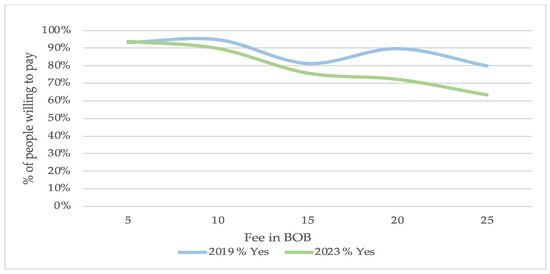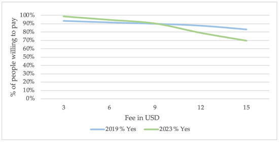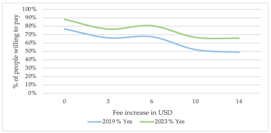 Figure 2 shows the general results regarding acceptance levels for different fees. As expected, the curves for both years demonstrate an inverse relationship between the initially proposed fee and WTP, where higher fees correspond to a lower WTP. The position of the 2023 curve, which shows the percentage of people accepting the proposed fee, is to the right of the corresponding 2019 curve. This indicates that, in general, visitors were more willing to pay the proposed amounts in 2023 than they were in 2019.