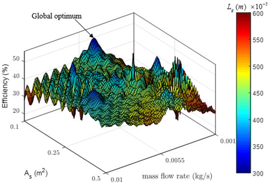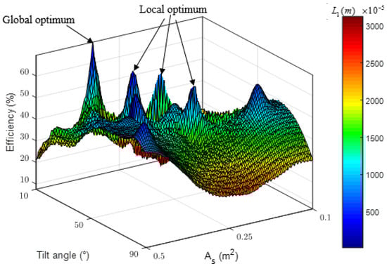 From Figure 3 and Figure 4, it is evident that even a slight change in the DPs can impact the SS-FPC efficiency. Moreover, as a function of the DPs, numerous local and/or global optima can be found in terms of the SS-FPC system’s efficiency, as shown in Figure 3 and Figure 4. Therefore, it is crucial to determine the most suitable DPs by conducting a design optimization of the SS-FPC system.