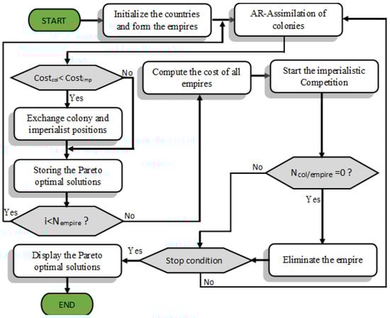 Recently, Bilel et al. [25] developed an evolutionary MOCCA method that was influenced by competition between imperialists. Figure 5 displays the flowchart of the MOCCA algorithm. This algorithm integrates the attraction and repulsion operators in order to acquire the best compromise between convergence and diversity. These operators are guaranteed by the random crossover and mutation concepts [25]. Additionally, the fast non-dominated sorting strategy is employed to identify non-dominated solutions that make up the Pareto front.