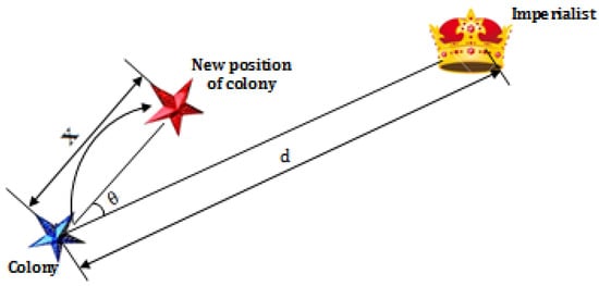Because of the dominance of imperialists, the colonies are split up among them to establish the initial empires. Every initial empire consists of a single imperialist and numerous colonies. Once the initial empires are established, the colonies begin shifting towards their respective dominant imperialists (Figure 6). In this motion, both and X are numbers uniformly produced: X as well as . d denotes the distance from the imperialist to the colony, and should exceed one. is a variable that indicates the deviation in direction [22,25].