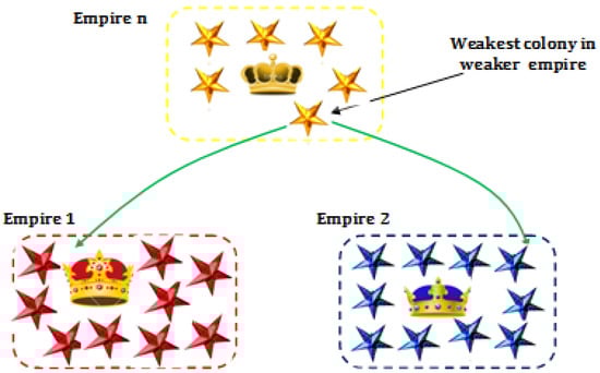 and are, respectively, the cost of the ith and the nth imperialists. r denotes the objective function number. signifies the j objective function value for imperialist n. and represent, respectively, the maximum and minimum j objective function values in every iteration. designates the best value of the j objective function based on the optimization procedure. The nth imperialist’s normalized power is computed as follows [23]: