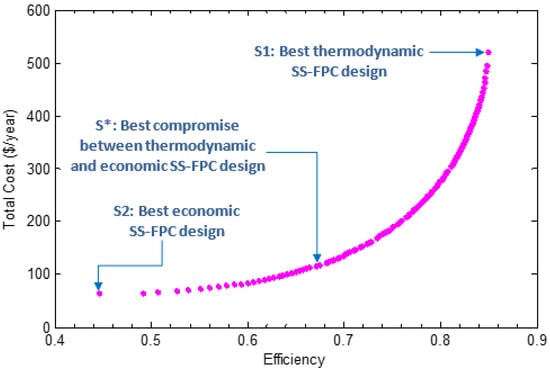 This part explores the thermodynamic and economic aspects of the SS-FPC system by considering both efficiency and total cost as defined in Equations (30) and (36) simultaneously. Table 2 illustrates the search domain (SD) of the design parameters (DPs).