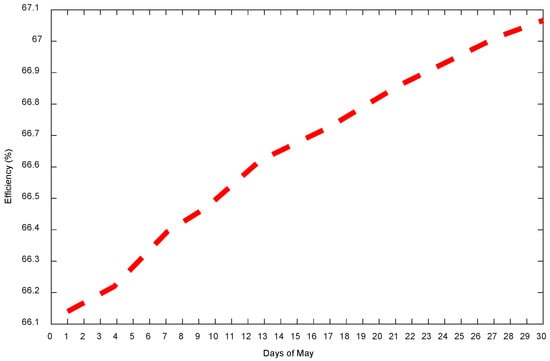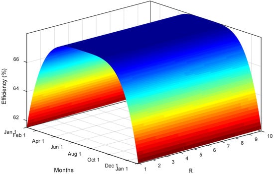 From Equation (30), it is shown that the SS-FPC efficiency is significantly dependent on several DPs, including the absorption plate area, reflection tilt angle, insulating thickness, mass of water, mass flow rate of the pump, and thickness of the glass. Subsequently, the influence of these DPs on the evolution of SS-FPC efficiency is studied. In fact, in each case, as presented in Table 1, only one DP has been varied while the others were considered to be constant. The efficiency was measured at each hour (from 8:00 a.m. to 16:00 p.m.), and the average daily efficiency was recorded.