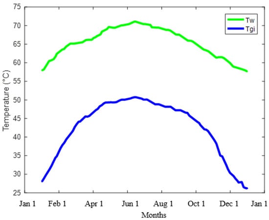 and indicate the number of collectors and the heat removal factor. and designate the collector’s absorptance–transmittance product and the intensity of solar radiation on the collector’s tilted surface. represents the coefficient of the total heat transfer for the collector.