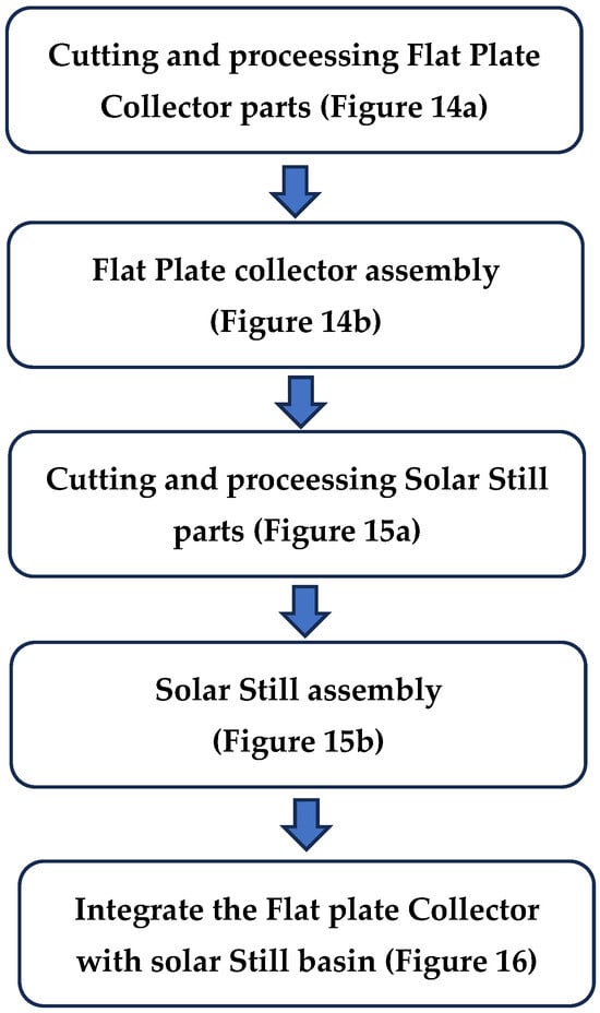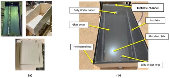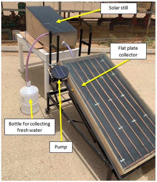Figure 2 depicts the solar still (SS) system coupled with a flat plate collector (FPC), called an SS-FPC system. The SS-FPC system works as a high-temperature distillation method. The SS-FPC works by enhancing the heat transfer process within the still through five steps as follows: