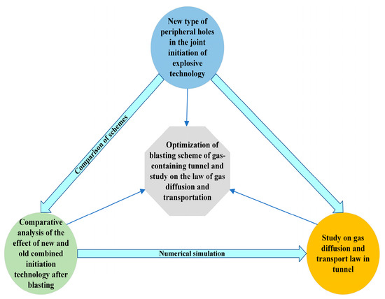 The above study mainly analyzed the ventilation conditions of gas diffusion and transport throughout the tunnel, however, the area near the palm face is the most prone to gas accumulation phenomena and an important safety hazard area. This paper takes a gas tunnel under construction in China as a research object, first of all, to carry out a comparative analysis of the blasting effect of the two old and new peripheral holes and, combined with detonation technology, we demonstrate the superiority of the new peripheral hole joint detonation technology. On this basis, we further use Ansys Fluent 2022 R1 software to simulate the gas flow field during tunnel blasting and excavation, we respectively study the gas spatial distribution characteristics of the gas near the face of the palm of the post-burst ventilation and non-ventilation of the two cases and consider the time of the flow characteristics of the gas, and we analyze the effect of ventilation on the concentration and distribution of the gas, the division of the significant impact of the gas near the face of the palm of the area, and the gas concentration of the tunnel to monitor the optimization of the ventilation to provide a reference for the gas concentration. The technical roadmap of the article is shown in Figure 1.