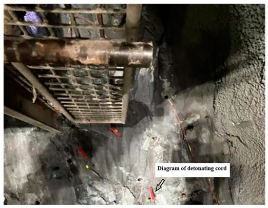 The tunnel inlet length is 3500 m, the rock body is broken, rock stability is poor, and the average compressive strength is 95~120 MPa. The original program adopts “detonating cord + digital electronic detonator” detonation technology (Figure 2) and the use of a three-armed rock drilling cart for drilling. The borehole parameters are shown in Table 1, the borehole layout diagram in Figure 3.