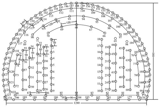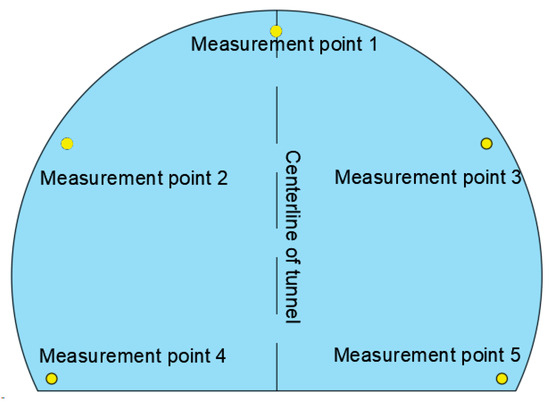 The CJG100 light interference type methane meter was used to monitor the gas concentration in the wind flow of the excavation face. The measurement points selected for the face of the arch, side walls, and the bottom plate were each 200 mm from the arch, side walls and the bottom plate. For the five measuring points, a methane meter was used, and the meter can be monitored by real-time gas concentration data transmission to the backstage monitoring system. The arrangement of the measurement points in the cross-section is shown in Figure 20.