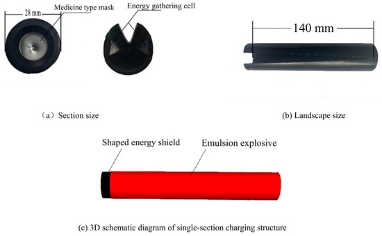 A fusion device is made of PVC polymerization pipe and a metal drug cover, with PVC polymerization pipe for the side of the cylindrical opening and PVC polymerization pipe on both sides of the inner wall of the two polymerization grooves. The metal drug cover is conical, placed in the PVC polymerization pipe at one end. The working principle of the poly charge is the use of the explosive’s special charging structure (cavities) to transfer energy to the drug cover. For the conical drug cover, the energy generated by the explosion in the axis of convergence forms a high-speed metal jet detonation of the next section of explosives, playing a role in the transmission of explosives. At the same time, the two built-in aggregation device slots and the excavation contour line coincide and can be efficiently utilized along the radial propagation of explosives’ explosion shock wave energy, increasing the peripheral hole spacing as well as the role of the light explosion layer of the explosion energy. The polymerization device of the PVC polymerization pipe points out of the excavation contour of the surrounding rock, through the pipe wall attenuation of the shock wave acting on the surrounding rock, playing a role in protecting the surrounding rock. The polymerization device and charge structure are shown in Figure 4.
