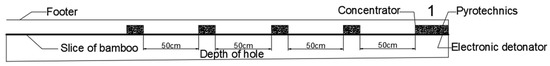 The design of the new program still includes the idea of explosives in accordance with sections of certain size bound to the bamboo sheet, without the use of detonating cord and instead using the polymerization device. As the plateau tunnel is made using three-arm rock drill truck drilling, with a peripheral hole depth of up to 4 m, the length of the charge needs to be about 3 m. With the use of polymerization device loading mode, for the first section of emulsion explosives, using a knife to cut one end flat, the polymerization device will be pressed into the emulsion explosive plastic film packaging, tie at 1 position on the bottom end of the bamboo sheet, and then both ends of three and a half sections of emulsion explosives are cut with a knife. The same method is used when the polymerization device is inserted into plastic film packaging, bound to the bamboo sheet. Each section of the explosives has a spacing of 50 cm, and for all the polymerization devices, the side with the opening points to the bamboo sheet. Finally, a section of emulsion explosives without poly devices is tied to the bamboo sheet, with the same interval of 50 cm, and the final length of the charge is 305 cm. Finally, the combination will be transported to the tunnel to blast the palm face. In the primer, a digital electronic detonator is inserted into the peripheral holes after adjusting the combination of the angle of the poly slot and the excavation contour line coincides with the blasting operation. The poly energy device charging structure is shown in Figure 5.