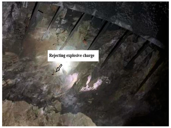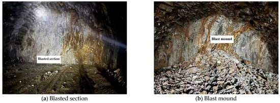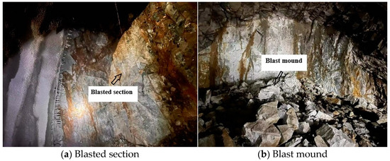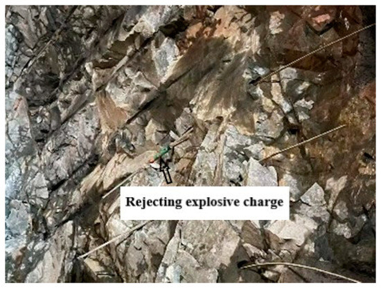 After on-site research, the peripheral holes for spaced polymerization devices loading ten times the cycle of feeding the field loading and post-blast effect details are shown in Table 3. Table 3 shows that the peripheral holes had a depth of 3.8 m, and with the cycle of post-blast footage it was 3.4~3.6 m. The number of digital electronic detonators used increased, with an average of 220 rounds used in one cycle, and the unit consumption of explosives decreased, ranging between 0.91 and 0.97. The half-hole rate associated with perimeter holes for post-blast effect evaluation exceeded 80% on nine occasions, which is a good level, and was below 80% only once, which is an average level. Only the first test was below 90 per cent, and all subsequent tests were above 90 per cent, which is a good level. The loading time of each cycle was significantly reduced, with an average time of 1 h. The overall contour smoothness in Figure 9a of the actual on-site research after blasting is good, and the half-hole marks are clear. In Figure 9b, the burst pile is concentrated and dense, with a general rate of chunking. The shortcomings of the second test are that there was a refusal to detonate, combined with the actual construction of the site analysis, due to the second production of poly energy device spacing charge combination, the distance between the poly energy device spacing not being 50 cm, or even more than 80 cm, and because of the surrounding rock lithology is poor and the existence of the phenomenon of collapsed holes, so the ability of poly energy devices to detonate was reduced and led to the first half of the explosives refusing to detonate. The polymerization device charge refused to explode as shown in Figure 10.