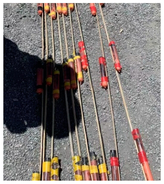 The new blasting program’s shell hole parameters are unchanged, and the perimeter holes are loaded with spaced poly energy devices. Before loading, firstly, according to the technical points, the explosives of the polymerization device are assembled, the explosives are spaced 50 cm, and the length of loading is 305 cm (Figure 8). The combination is transported to the palm surface to be blasted. The digital electronic detonator is inserted in the primer and then slowly put into the peripheral hole, and finally the digital electronic detonator is grouped for detonation.