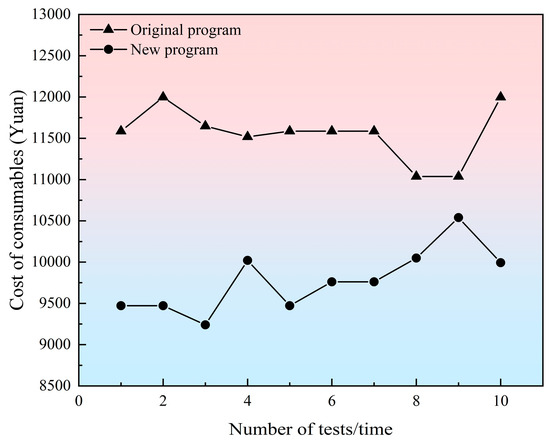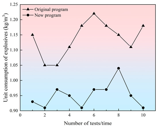 (4) The original program’s consumables include emulsion explosives, detonating cord, and a digital electronic detonator, while the new program’s consumables include emulsion explosives, polymerization devices, and a digital electronic detonator. Due to the plateau area, the consumables’ cost is higher, and the price of the emulsion explosives is 12,000 ¥/t, detonating cord is 7 ¥/m, the digital electronic detonator unit is CNY 26, and the polymerization device unit is CNY 2. Compared to the old program, for the cost of consumables of each cycle for statistical purposes, it was found that with the use of the new program costs are greatly reduced, each cycle can save a cost of consumables of around CNY 2000.