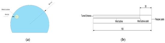 CATIA P3 V5-6R2020 modeling software was used to establish a three-dimensional numerical calculation model of the tunnel. The length of the tunnel is 150 m, the cross-section radius is 7.4 m, the wind turbine is located in the left side of the tunnel exit at the waist of the arch, the radius of the wind turbine is 0.8 m, the length of the wind turbine is set to 120 m, and the wind turbine exit and the distance from the face of the palm is 30 m, in accordance with the following formula after the calculation of the distance in the ventilation of the effective range of the cross-section of the tunnel exit and the longitudinal wall of the wind turbine. The cross-section of the tunnel exit and longitudinal section of the wind pipe side wall are shown in Figure 15.