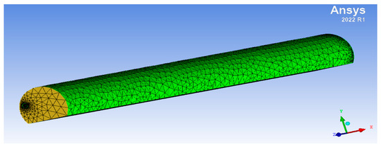 After calculation, the effective range Ls of the wind flow is 39 m, and the distance between the outlet of the wind pipe and the palm face is within this range. The model is meshed using ICEM-CFD 2022 R1 software and the meshed mesh is shown in Figure 16.