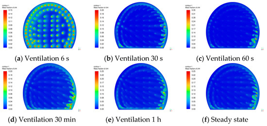 According to the comparison of on-site monitoring and numerical simulation data, it is found that the average error of both is less than 5%, which indicates that the numerical simulation results are accurate and referable. Measurement points 1 and 2 show a reduction in gas concentration to within the safe range in about 30 s of ventilation, a small gas accumulation will occur at measurement points 3 and 4, with the gas concentration fluctuating in a small range and the concentration being roughly maintained at around 5% after 30 s of ventilation, and the gas concentration at measurement point 5 at the foot of the arch on the opposite side of the wind pipe will increase with ventilation, which is prone to a large-scale gas accumulation.